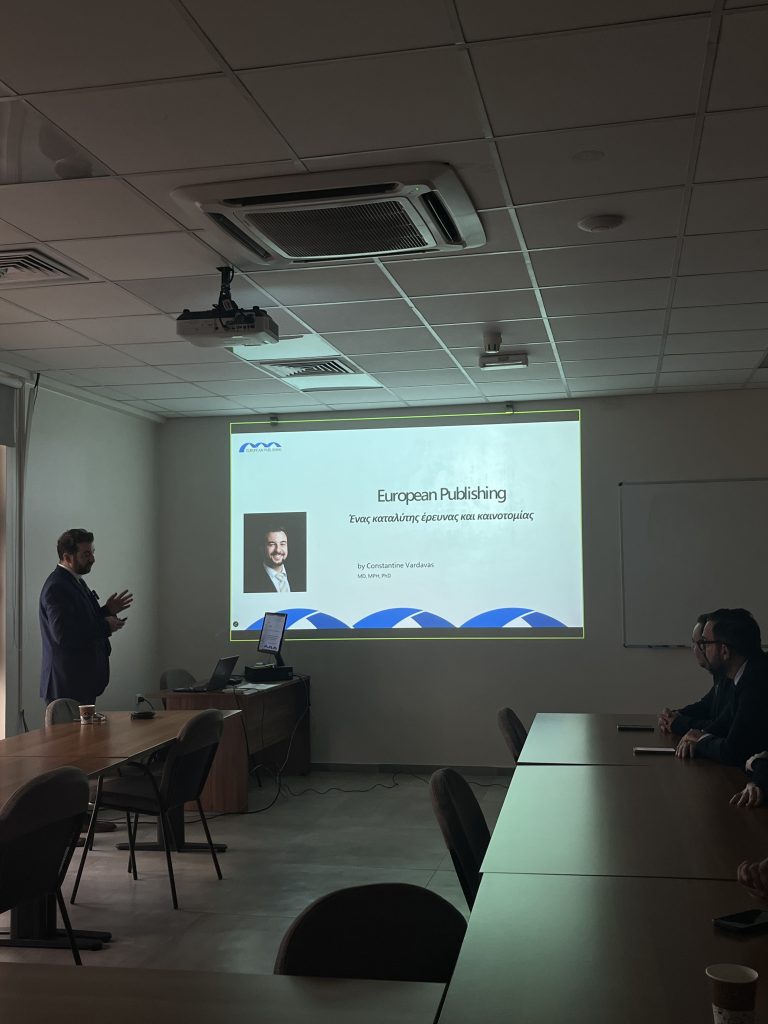 Η European Publishing είναι ένας εκδοτικός οίκος Ανοιχτής Πρόσβασης (Open Access). Η εταιρεία ειδικεύεται στην επιστημονική καινοτομία και την ψηφιακή διάδοση της έρευνας, προωθώντας την αριστεία και χρησιμοποιώντας καινοτόμες πλατφόρμες για τη δημιουργία και τη διάχυση των επιστημονικών δημοσιεύσεων. Με ένα αποτύπωμα που περιλαμβάνει πάνω από 7 εκατομμύρια full text downloads και περισσότερους από 8.000 ακαδημαϊκούς συγγραφείς, η European Publishing εξερευνά νέους δρόμους συνεργασίας μεταξύ της έρευνας και της καινοτομίας, αξιοποιώντας τα πλεονεκτήματα της Ανοιχτής Επιστήμης (Open Science) για την προώθηση της ταχύτερης και ευρύτερης καινοτομίας. Κατά την παρουσίαση, ο εισηγητής και CSO της εταιρείας,καθηγητής Κωνσταντίνος Βαρδαβάς, έδωσε έμφαση στις νέες υπηρεσίες της εταιρείας που υποστηρίζουν τους νέους ερευνητές στα συγγραφικά τους εγχειρήματα, προσφέροντάς τους εργαλεία και καθοδήγηση για την επιτυχή δημοσίευση του έργου τους.