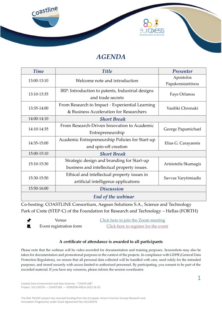 The Science and Technology Park of Crete (STEP-C) of the Foundation for Research and Technology – Hellas (FORTH), as a Hub of the European EURAXESS Network, in collaboration with COASTLINE Consortium, Aegean Solutions Α.Ε., is organizing an online training seminar on Wednesday, January 22, 2025, from 13:00 to 16:00 (EET).